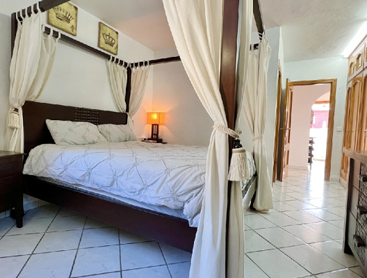 Vila o ploše 152 m2 má prostorný obývací pokoj s odděleným jídelním koutem a kuchyní, 4 ložnice a 3 koupelny. Přes prosklenou zimní zahradu se vstupuje k bazénu a terase, která jej obklopuje. Na zahradě je k dispozici také kůlna a přístřešek na auto s místem pro dvě auta.