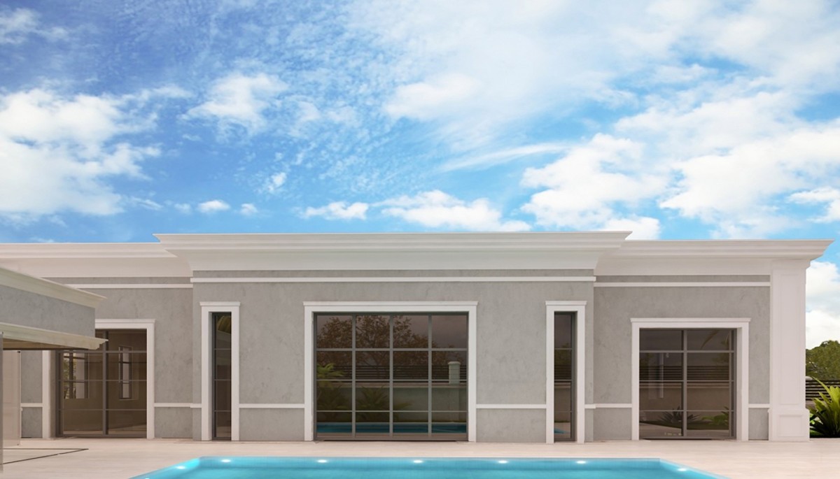 Tato impozantní vila je rozdělena do dvou úrovní. Při vstupu nás přivítá prostorná vstupní hala, která vede do velkého obývacího pokoje s dvojitou výškou stropu. Kuchyň bude kompletně vybavena špičkovými spotřebiči a může být umístěna podle přání buď v otevřeném prostoru, nebo za posuvnými dveřmi. V hlavním patře se nachází tři velmi prostorné ložnice, se širokými okny a šatnami.