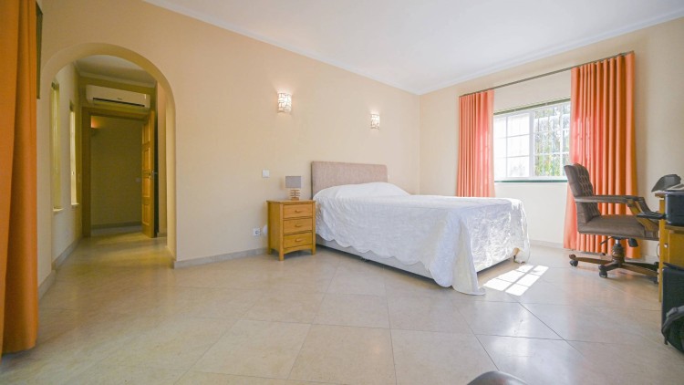 Hlavní ložnice je velmi prostorná a má přístup na terasu s vnějším schodištěm vedoucím dolů na hlavní terasy. V hlavní koupelně je k dispozici vana, sprchový kout a dvě umyvadla.