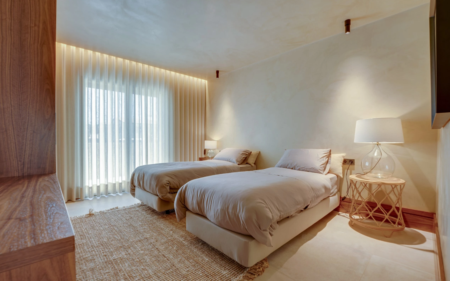 V horním patře je umístěno hlavní apartmá s volně stojící vanou v ložnici a venkovní sprchou. Dvě další apartmá nabízejí pohodlí, soukromí a rafinované povrchové úpravy. Obě ložnice spojuje velká terasa orientovaná na jih, která interiéry zaplňuje přirozeným světlem a otevírá široký výhled na moře.