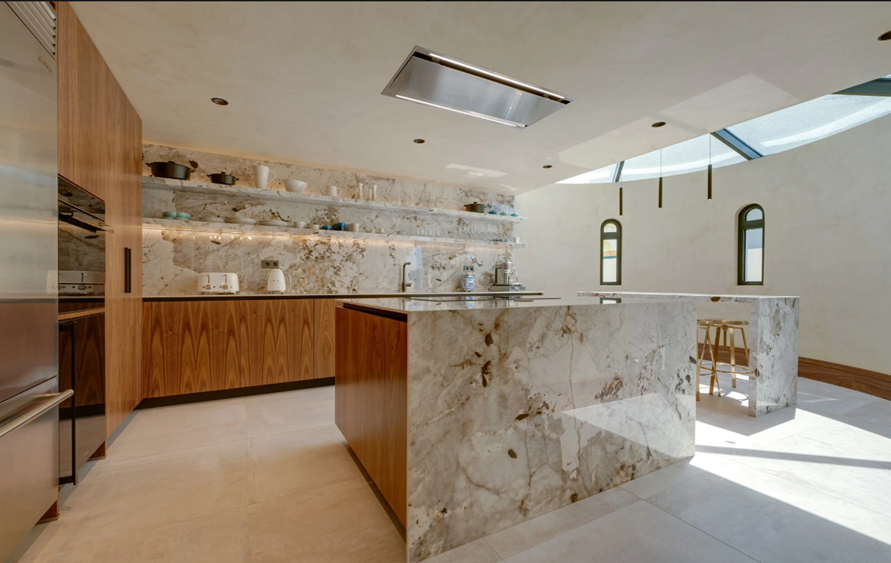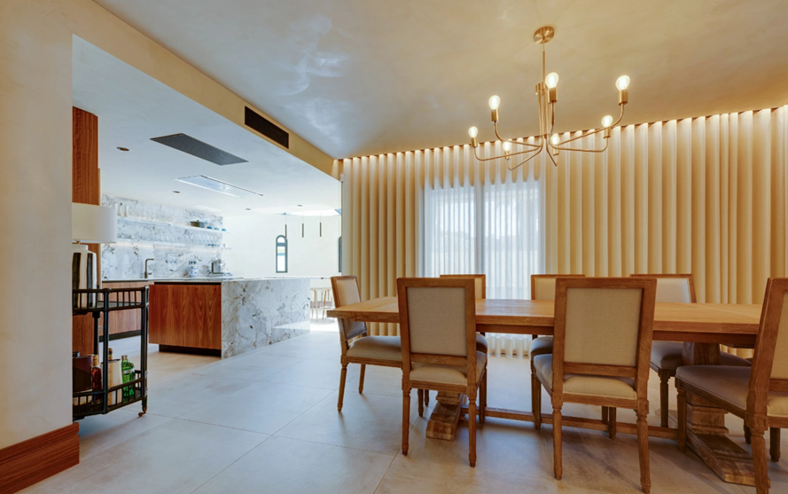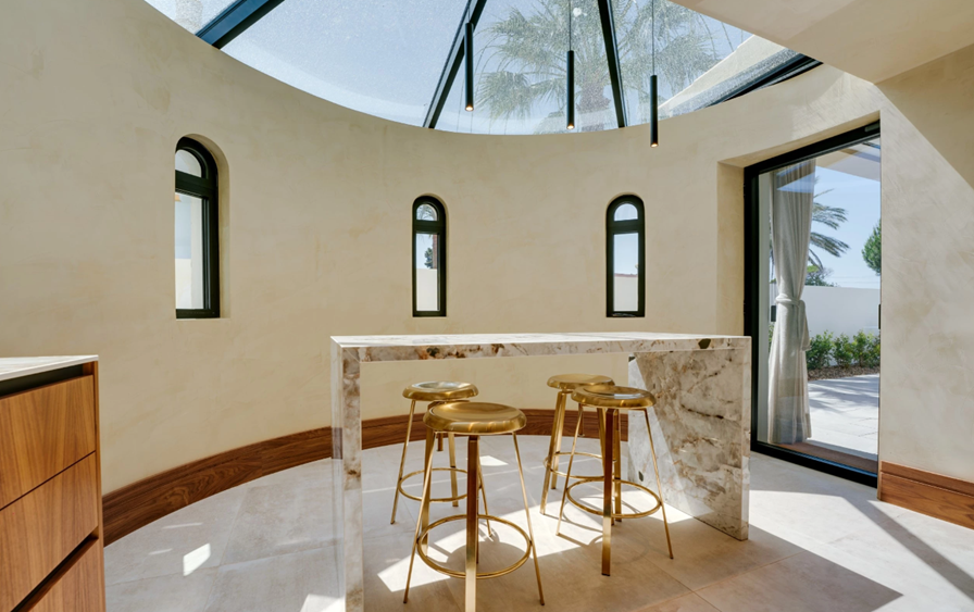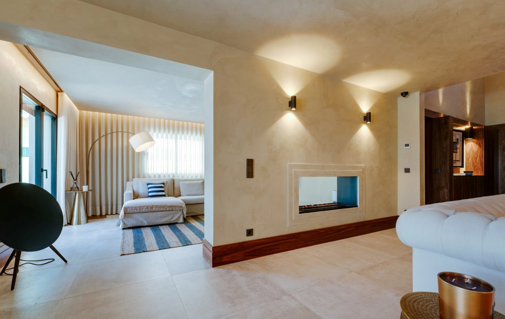 V přízemí vila vás přivítá vstupní hala, která vede ke dvěma elegantním apartmá, z nichž každé má vlastní koupelnu a přímý přístup na venkovní terasy. Prostorný obývací pokoj je vybaven velkou vestavěnou televizí a vede do samostatné obývací části s designovým etanolovým krbem. Interiéry jsou vyvedeny v jednotném stylu, kde ořechové dřevo, ručně zpracované povrchy stěn a prémiové osvětlení poskytují pohodlí a charakter. Jídelna plynule navazuje na nádhernou algarveskou kuchyň. V jejím středu se nachází ostrůvek s kamennými okraji, který kombinuje funkčnost a nadčasovou eleganci a je doplněn praktickým snídaňovým koutem. Prémiové spotřebiče spojují styl s konektivitou, zatímco speciálně navržené střešní okno zaplavuje prostor světlem a zdůrazňuje ručně vyráběné textury a rafinované materiály.