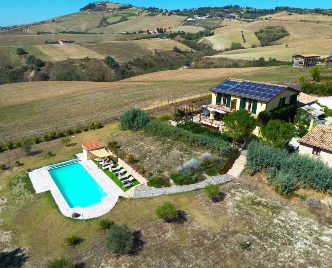 Rozlehlá venkovská vila o celkové výměře asi 420m2 s úžasným výhledem na nejvyšší horu Abruzza Gran Sasso je umístěn na vyvýšeném místě blízko městečka Bellante jen 12km of pobřeží Jaderského moře. Za necelou hodinu jízdy také dojedete na známé Campo Imperatore ve vysokých horách Abruzza, kde začíná mnoho krásných turistických tras a nacházejí se zde také lyžařské terény. Letiště v Pescaře se nachází 45 minut od domu a letiště v Římě asi 2.5 hodin. Co se týče občanské vybavenosti, menší obchody, bary a pizzerie jsou vzdáleny jen 3km od vily a 8km daleko je větší obchodní centrum.